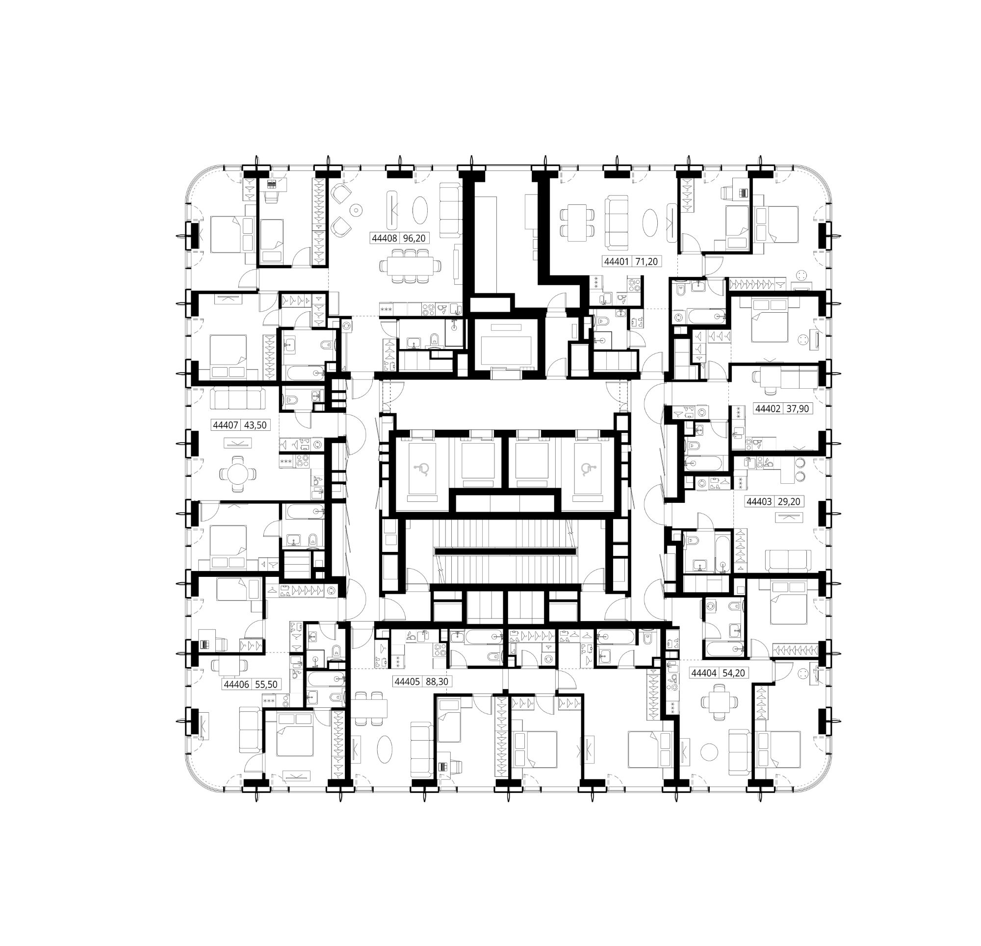 Продаётся 3-комнатная квартира общей площадью 88.30 м² без отделки в ЖК City Вау, квартале Pacific, на 44-м этаже 46 этажного дома.