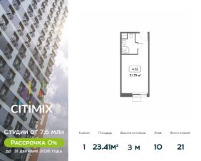 Продаётся студия-апартаменты в строящемся доме (Корпус 4), срок сдачи: III-кв. 2026, общей площадью 23.41 кв.м., на 10 этаже.