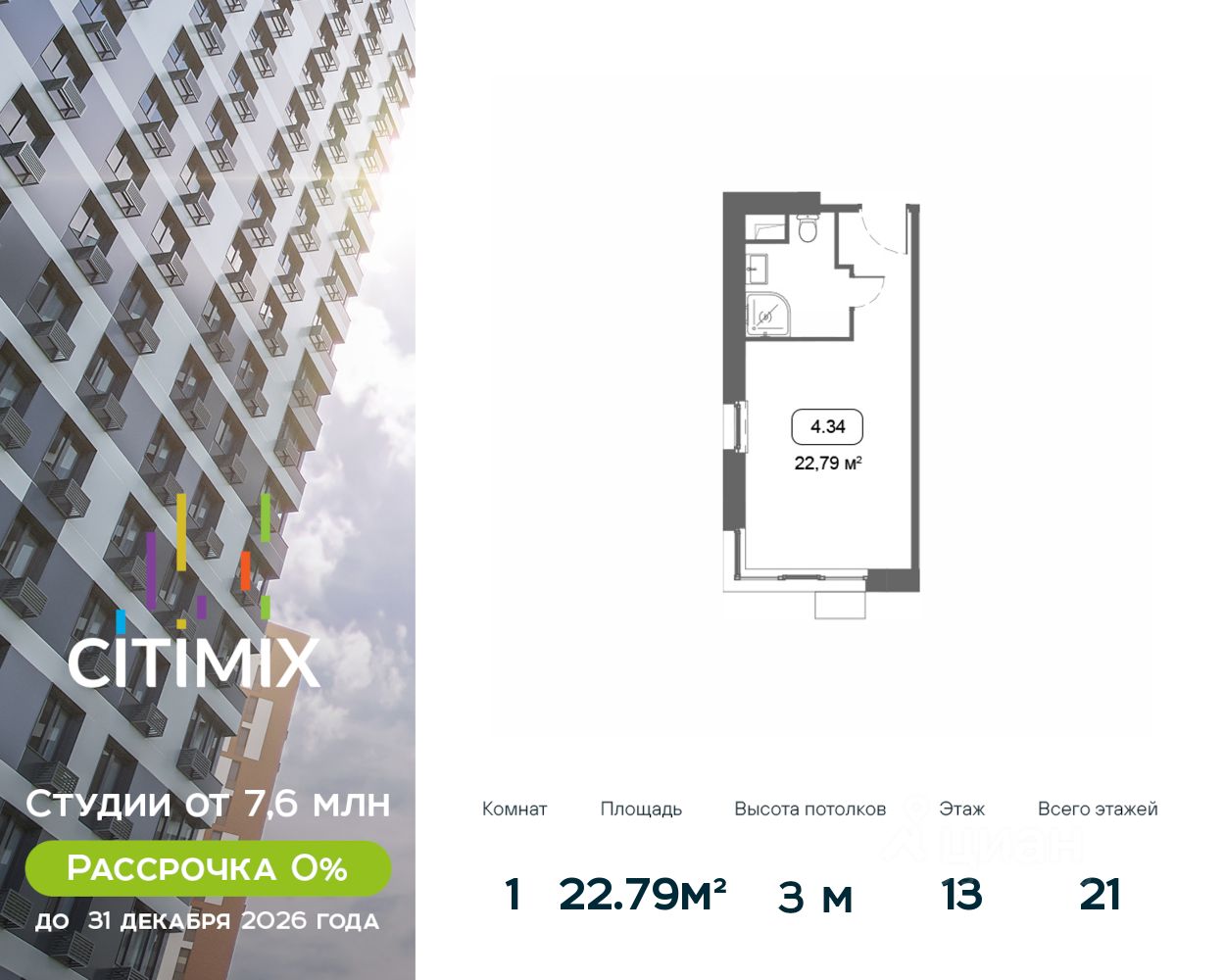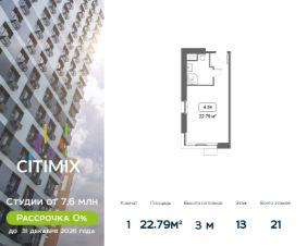 Продаётся студия-апартаменты в строящемся доме (Корпус 4), срок сдачи: III-кв. 2026, общей площадью 22.79 кв.м., на 13 этаже.