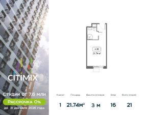 Продаётся студия-апартаменты в строящемся доме (Корпус 4), срок сдачи: III-кв. 2026, общей площадью 21.74 кв.м., на 16 этаже.