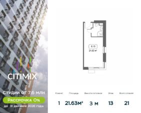 Продаётся студия-апартаменты в строящемся доме (Корпус 4), срок сдачи: III-кв. 2026, общей площадью 21.63 кв.м., на 13 этаже.