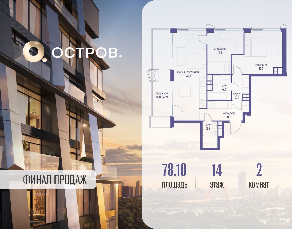 Продаётся 2-комн. квартира от застройщика: общая площадь 78.10 м², жилая 28.30 м², кухня 26.10 м², 14-й этаж, жилой квартал "Остров 12", корпус 2 (секция 1). Срок сдачи: 1 квартал 2029 года.