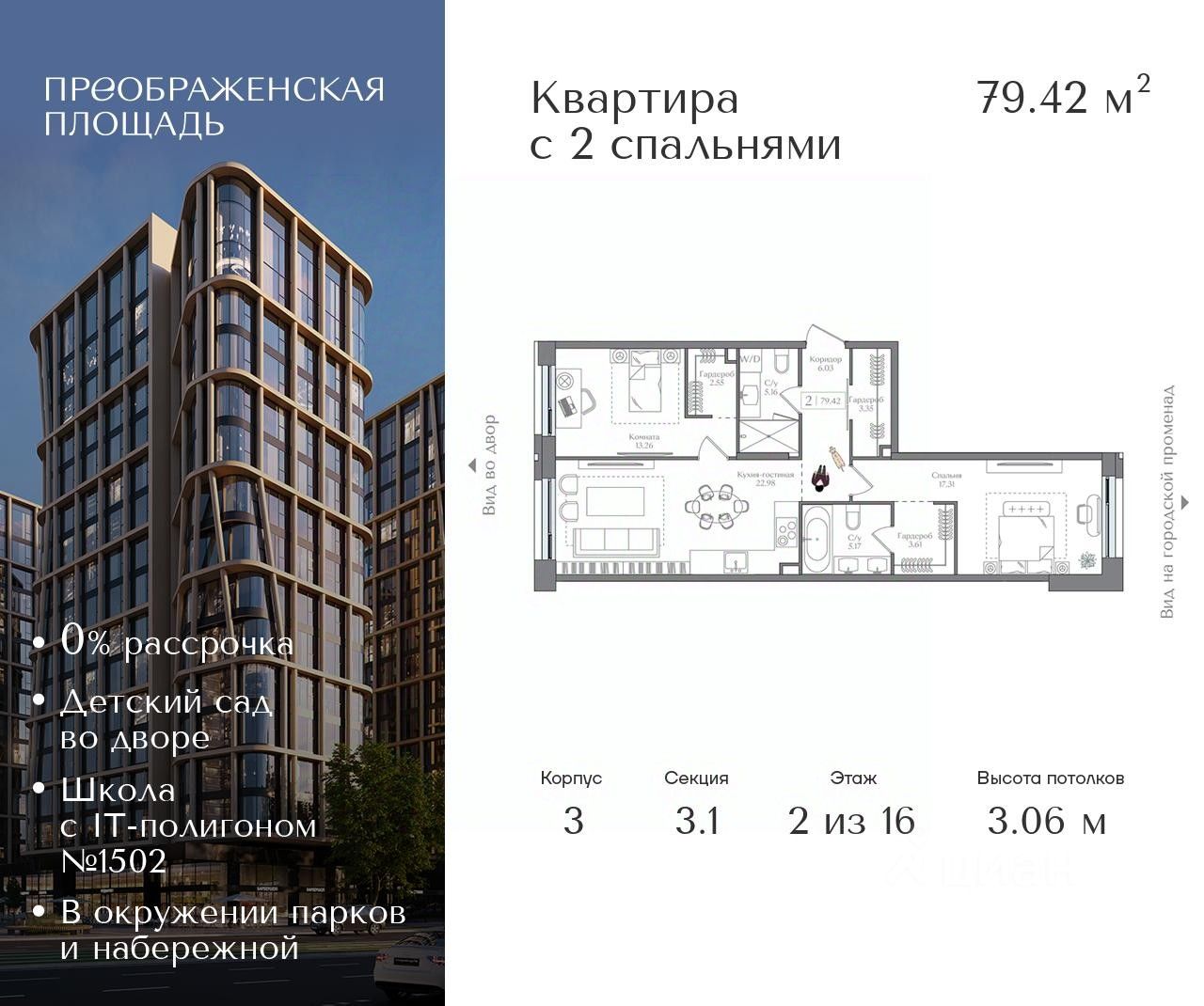 Квартира на 2 этаже в жилом комплексе премиум-класса "Преображенская площадь". Общая площадь: 79.42 кв.м.