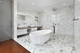 Натуральный камень, ценные породы дерева, спокойные теплые тона.