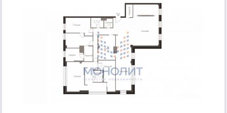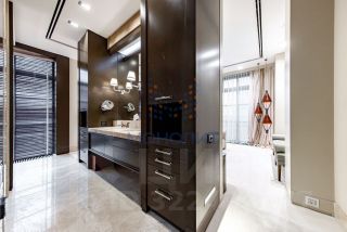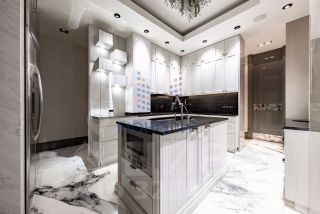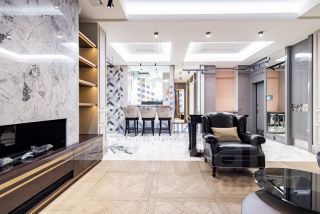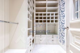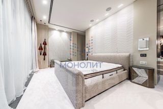 Продуманная планировка позволила разделить пространство на две функциональные зоны: общую зону отдыха и приватную. В первой части находится холл с вместительной гардеробной, рабочий кабинет, гостевой санузел, постирочная и просторная гостиная, совмещенная с кухней, барной зоной и столовой. Во второй - гостевая комната, детская спальня с ванной и гардеробной и мастер-спальня с большой гардеробной, ванной и душевой. В квартире предусмотрена система умный дом.
