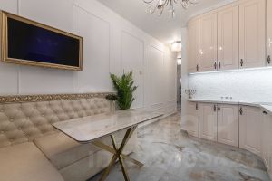 В интерьере использованы ручные ковры, добавляющие тепло и уют. Вся бытовая техника встроена, гармонично сочетается с мебелью, которая выполнена по индивидуальному заказу, что делает пространство единственным в своем роде.