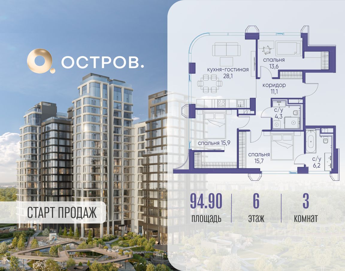Продаётся 3-комн. квартира от застройщика: общая площадь 94.90 м², жилая 45.20 м², кухня 28.10 м², 6-й этаж, жилой квартал "Остров 12", корпус 1 (секция 3). Срок сдачи: 1 квартал 2029 года.