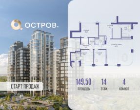 Продаётся 4-комн. квартира от застройщика: общая площадь 149.50 м², жилая 68.90 м², кухня 47.80 м², 14-й этаж, жилой квартал "Остров 12", корпус 2 (секция 4). Срок сдачи: 1 квартал 2029 года.