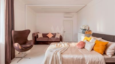Квартира с пятью спальнями и кабинетом в комплексе "Кассиопея" в Тверском районе Москвы. Квартира площадью 250 м² расположена на втором этаже. Интерьер оформлен в современном стиле в светлых лаконичных тонах. Установлены системы индивидуального кондиционирования. Квартира укомплектована мебелью и бытовой техникой.