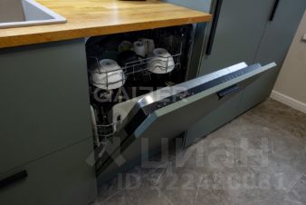 На кухне кухонный гарнитур с необходимой техникой, включая посудомоечную машину.