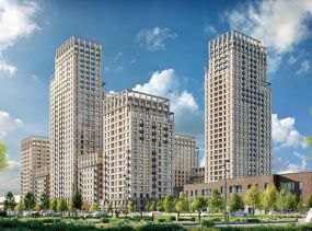 Квартира с кухней-гостиной и тремя спальнями в квартале "Метроном". Особенности планировки: окна в пол, лоджия, разнесённые спальни, предчистовая отделка, мастер-спальня.