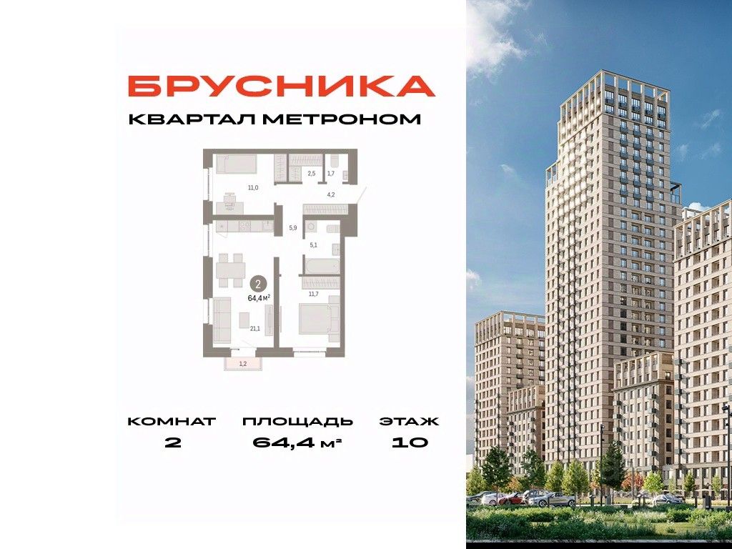 Квартира с кухней-гостиной и двумя спальнями в квартале "Метроном". Особенности планировки: второй санузел, окна в пол, разнесённые спальни, предчистовая отделка, балкон.