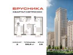 Квартира с кухней-гостиной и двумя спальнями в квартале "Метроном". Особенности планировки: окна в пол, предчистовая отделка, мастер-спальня, балкон.