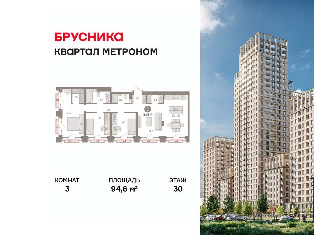 Квартира с кухней-гостиной и тремя спальнями в квартале "Метроном". Особенности планировки: второй санузел, французский балкон, вид во двор, предчистовая отделка, балкон.