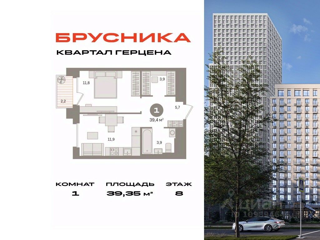 Квартира с кухней-гостиной и одной спальней в квартале Герцена. Особенности планировки: гардеробная, вид во двор, предчистовая отделка, балкон.