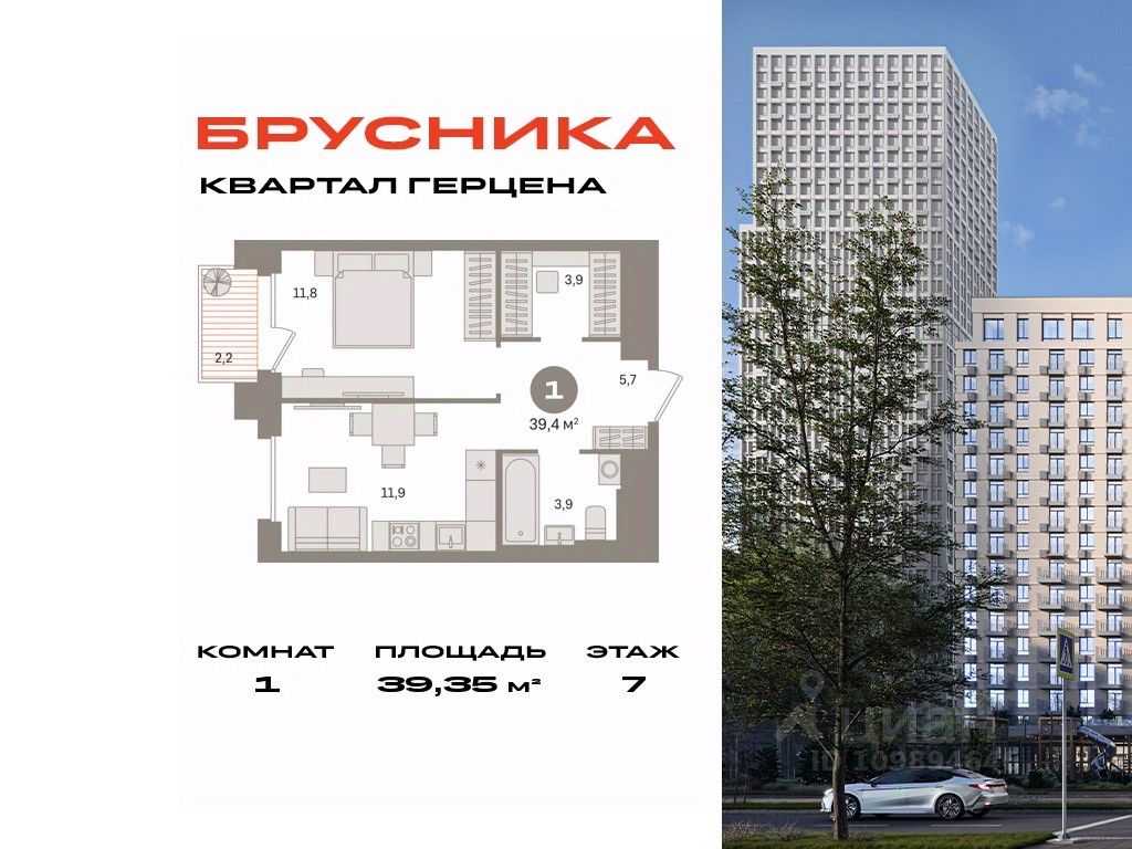 Квартира с кухней-гостиной и одной спальней в квартале Герцена. Особенности планировки: гардеробная, вид во двор, предчистовая отделка, балкон.