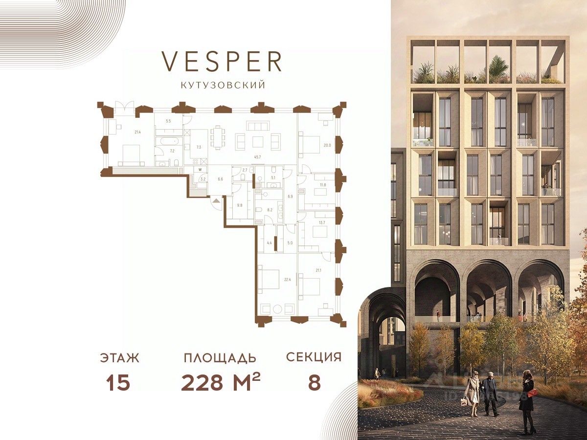 Продуманная приватная инфраструктура, собственный ландшафтный парк, близость магазинов и ресторанов делают Vesper Кутузовский достойным выбором для самых взыскательных клиентов: как для тех, кто любит уединение, так и для резидентов, которые стремятся быть в центре событий.