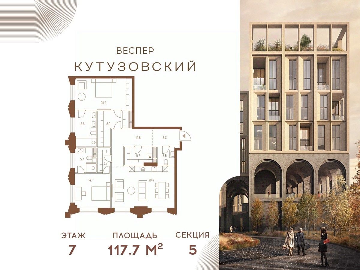 Продается квартира с 2-мя спальнями без отделки в корпусе 5.2 общей площадью 117,7 кв.м. на 7 этаже.