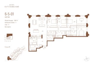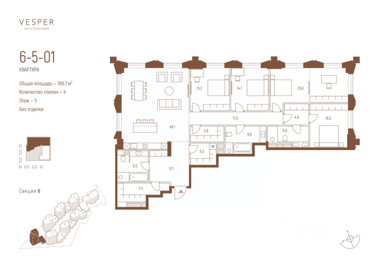 Продается квартира с 4-мя спальнями без отделки в корпусе 6.1 общей площадью 188,7 кв.м. на 5 этаже.