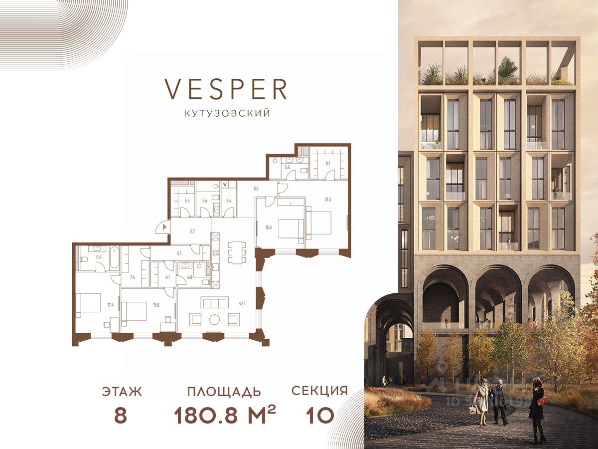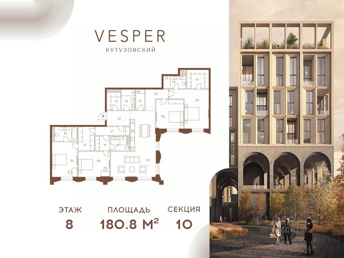 Продается квартира 4-спальнями без отделки, в корпусе 10.1 общей площадью 180,8 кв.м. на 8 этаже.