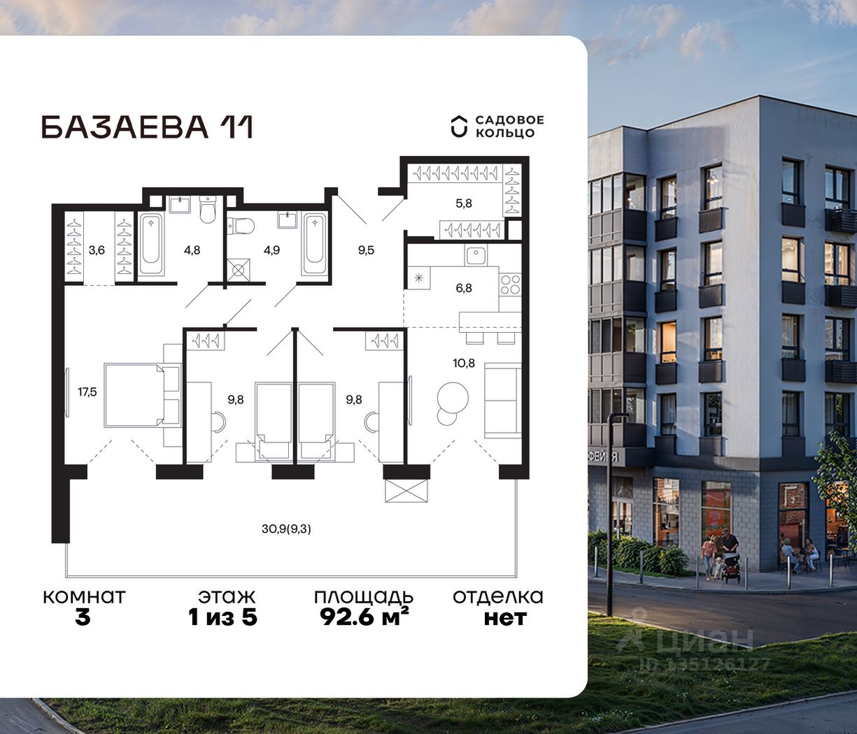 Продается квартира в ЖК "Базаева, 11" с 3 спальнями на 1 этаже 5 этажного дома. Общая площадь: 92.6 кв.м. Высота потолков 4.22 м. Срок сдачи 2 квартал 2027 г. Эскроу-счет. Застройщик ГК "Садовое кольцо".