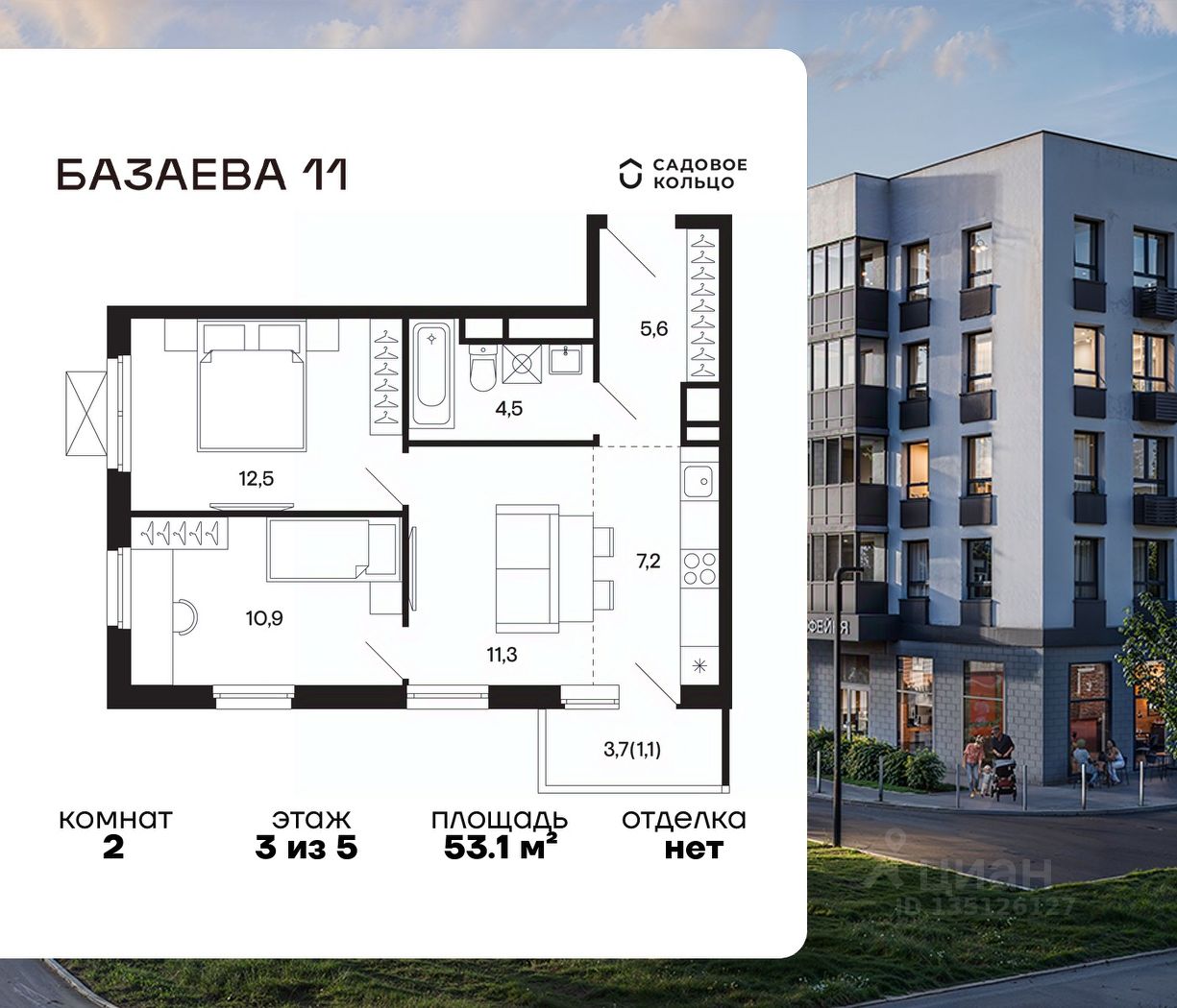 Продается квартира в ЖК Шаховская с 2 спальнями на 3 этаже 5 этажного дома. Общая площадь: 53.1 кв.м. Высота потолков 2.72 м. Срок сдачи 2 квартал 2027 г. Эскроу-счет. Застройщик ГК "Садовое кольцо".
