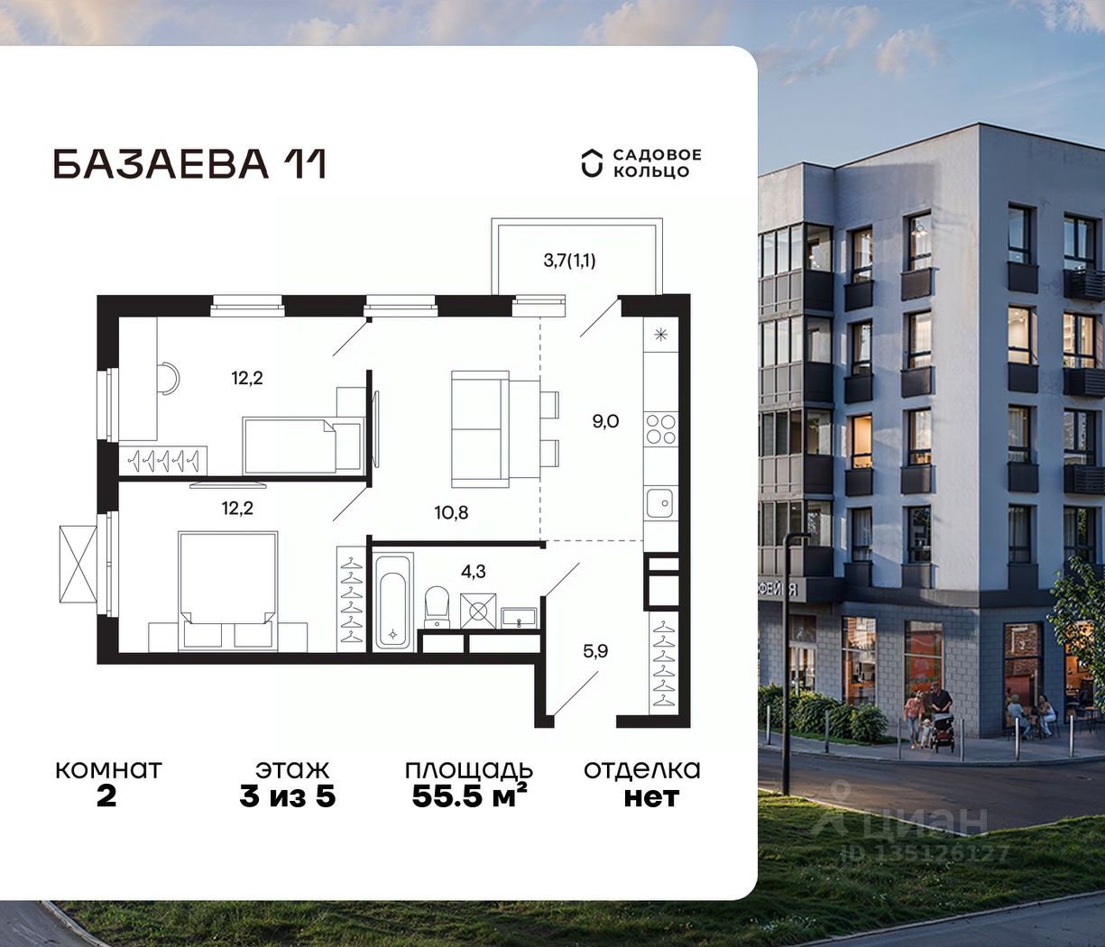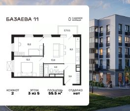 Продается квартира в ЖК "Базаева, 11" с 2 спальнями на 3 этаже 5 этажного дома. Общая площадь: 55.5 кв.м. Высота потолков 2.72 м. Срок сдачи 2 квартал 2027 г. Эскроу-счет. Застройщик ГК "Садовое кольцо".