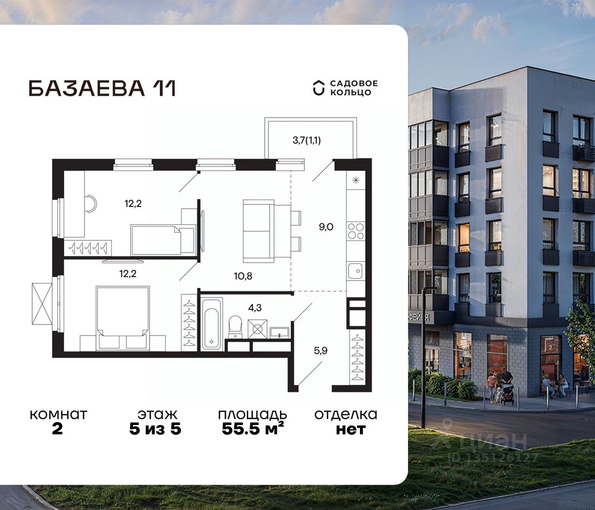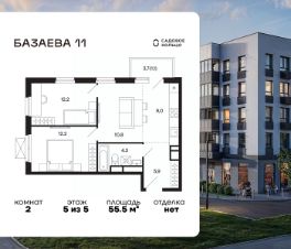 Продается квартира в ЖК Шаховская с 2 спальнями на 5 этаже 5 этажного дома. Общая площадь: 55.5 кв.м. Высота потолков 2.72 м. Срок сдачи 2 квартал 2027 г. Эскроу-счет. Застройщик ГК "Садовое кольцо".