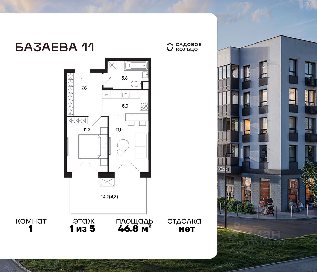Продается квартира в ЖК "Базаева, 11" с 1 спальней на 1 этаже 5 этажного дома. Общая площадь: 46.8 кв.м. Высота потолков 3.62 м. Срок сдачи 2 квартал 2027 г. Эскроу-счет. Застройщик ГК "Садовое кольцо".