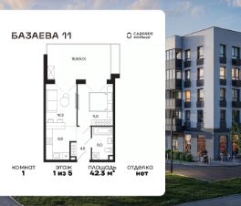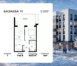 Продается квартира в ЖК "Базаева, 11" с 1 спальней на 1 этаже 5 этажного дома. Общая площадь: 42.3 кв.м. Высота потолков 3.17 м. Срок сдачи 2 квартал 2027 г. Эскроу-счет. Застройщик ГК "Садовое кольцо".