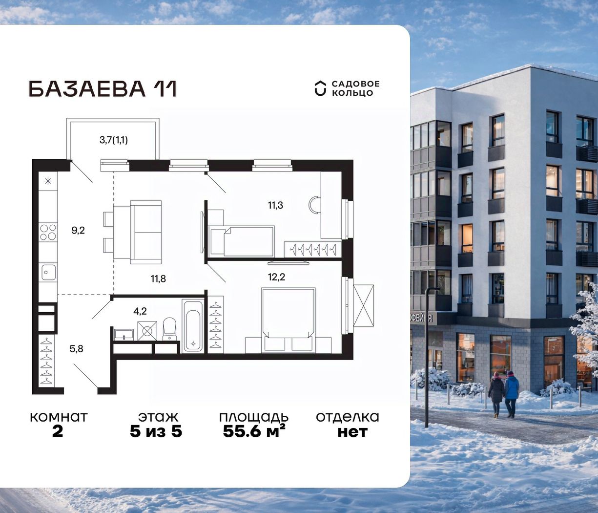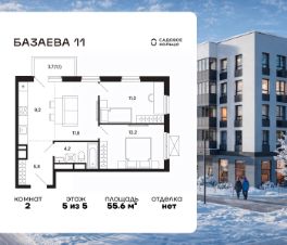 Продается квартира в ЖК "Базаева, 11" с 2 спальнями на 5 этаже 5 этажного дома. Общая площадь: 55.6 кв.м. Высота потолков 2.72 м. Срок сдачи 2 квартал 2027 г. Эскроу-счет. Застройщик ГК "Садовое кольцо".