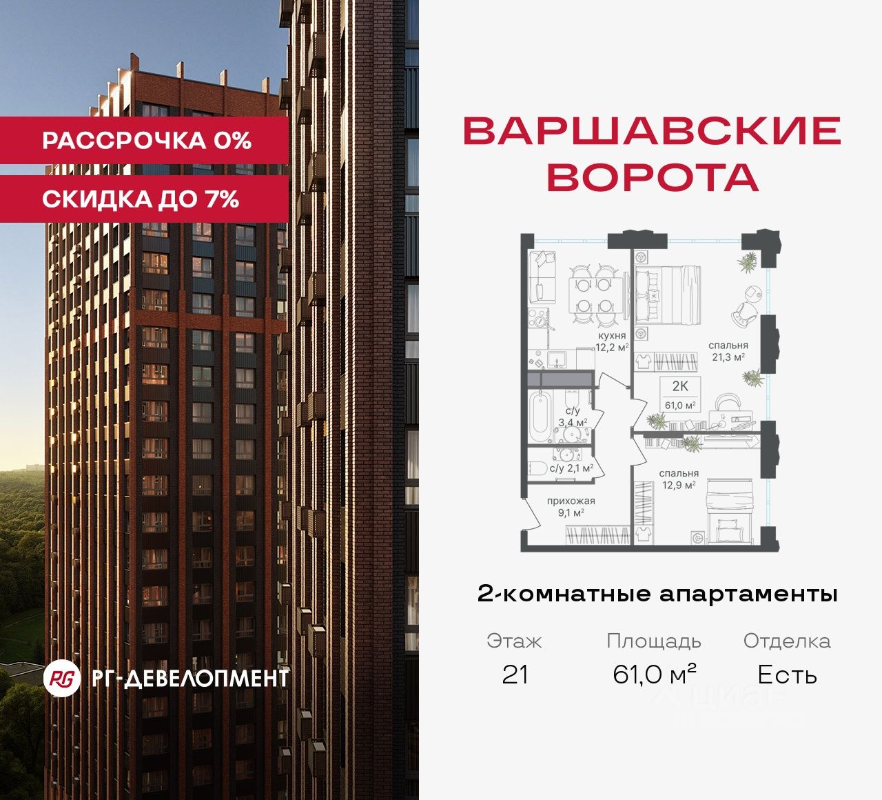 Рассрочка 0% + скидка 5%. Первый платёж 50% при ДДУ, второй 50% — через 12 мес. до ввода ЖК.
