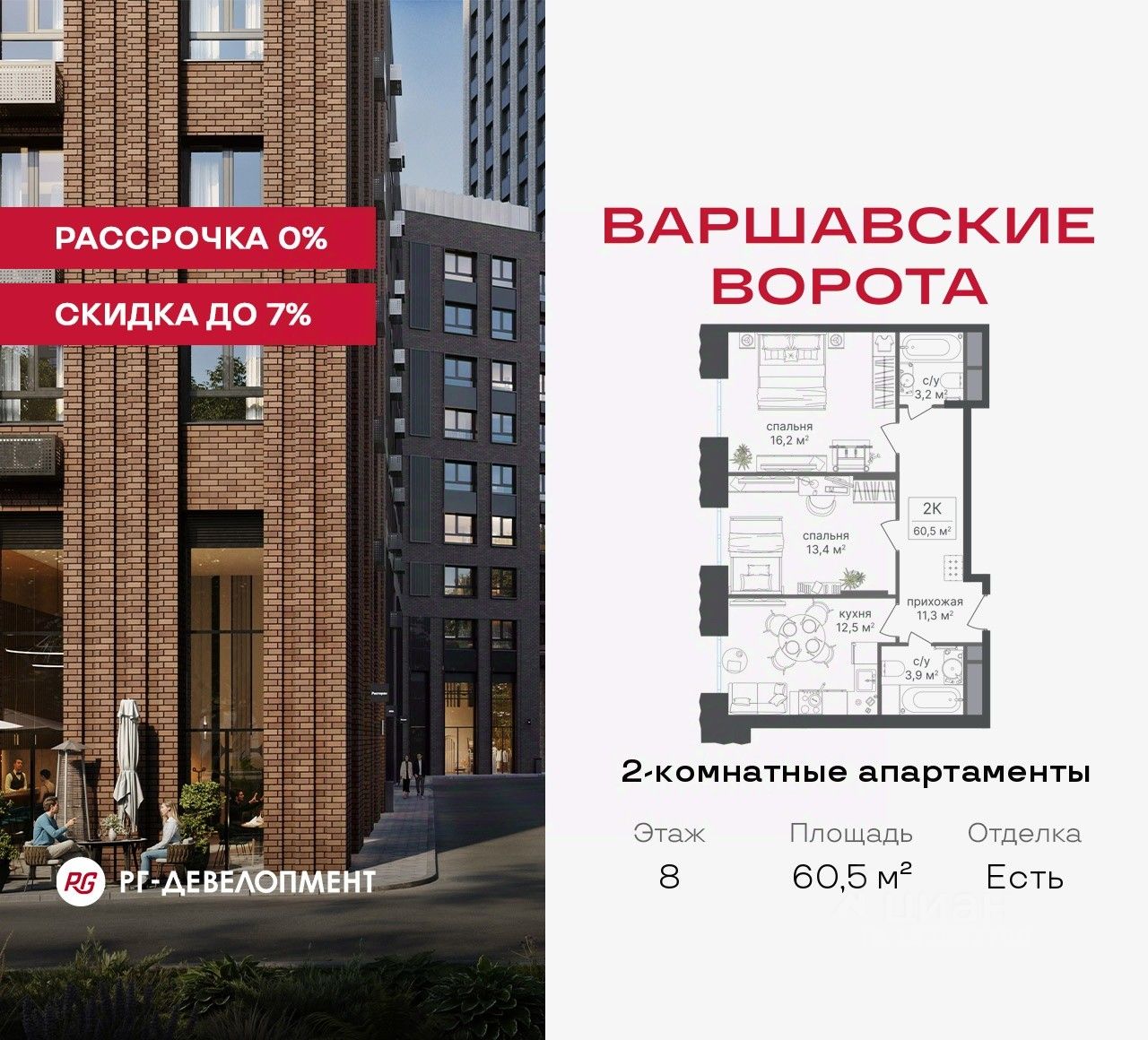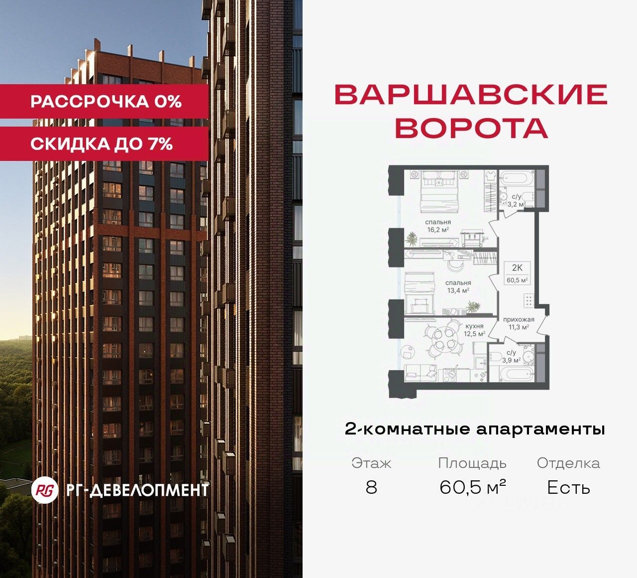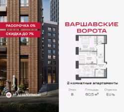 Продаются 2-комнатные апартаменты 60,5 кв.м. в МФК "Варшавские ворота" на 8-м этаже 30 этажного дома. МФК "Варшавские ворота" — это проект, в котором учтен широкий спектр требований: от транспортной доступности и развитой инфраструктуры до архитектурной выразительности и экологического окружения.
