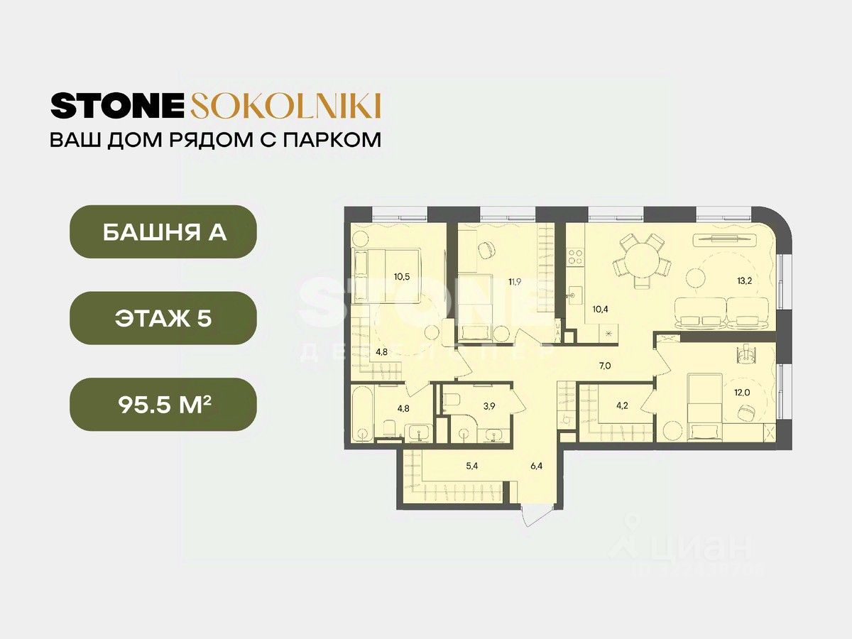Старт продаж квартир в ЖК STONE SOKOLNIKI от девелопера STONE. В продаже просторная и светлая трехспальная квартира с кухней-гостиной и тремя спальнями для реализации любого дизайн-решения, идеально подходящая большим семьям, члены которой уже нуждаются в личном пространстве и уединении. Современная архитектура проекта органично вписана в городскую среду. Концепция проекта разработана архитектурным бюро WALL Проект состоит из трех разновысотных башен высотой в 33, 28 и 24 этажа с чистой геометрией и увеличенной площадью остекления, которая позволит насладиться городской панорамой и видами на парк "Сокольники". Транспортная доступность - 10 мин. пешком до метро и БКЛ "Сокольники" и "Электрозаводская" - 12 мин. пешком до парка Сокольники - 10 мин. пешком до станции МЦД-3 "Митьково", которая позволит комфортно добираться в центр города и за его пределы Инфраструктура: В каждой входной группе предусмотрены помещения для временного хранения велосипедов, лапомойка, гостевой санузел, а также комната матери и ребенка. А колясочные появятся на каждом этаже - ведь это самое удобное решение для детей и их родителей. Планировочные решения: Планировки квартир в STONE Sokolniki создавались с учетом разнообразия современных сценариев жизни в городе. В проекте предусмотрены просторные кухни-гостиные, изолированные спальни с мастер-блоком, планировки для семей со взрослыми детьми, с двумя детьми разных возрастов. Благодаря грамотному зонированию квартир можно насладиться и временем с семьей, и уединением или, наоборот, устроить вечеринку вместе с друзьями. - Квартиры от 28 до 135 кв. м. Детский сад во дворе дома: Девелопер STONE осуществляет самостоятельный поиск оператора для детского сада, так как курирует наполнение проекта. На этапе финальной готовности будет выбран лучший оператор, отвечающий запросам качества и цены. Во всех своих проектах девелопер берет на себя ответственность за сдачу части помещений. Удобное хранение: В проекте STONE Sokolniki предусмотрена максимальная обеспеченность кладовыми. Хранения велосипедов в подземном паркинге возможно в зимний период, а летом будет организовано временное хранение на улице. Колясочные есть на каждом этаже всех трех жилых башен. - Колясочные на этаже - Кладовые для хранения Безопасная собственная территория дома, сим и паркинг: Внутри двора комфортно перемещаться пешком, все въезды в паркинг организованы по внешнему периметру. Велосипеды, самокаты и электросамокаты, детские беговелы и коляски - в приоритете, для всех колесных видов транспорта продуманы удобные маршруты движения и варианты хранения в разные сезоны. STONE - девелопер коммерческой и жилой недвижимости классов бизнес и премиум в Москве с 18-летним опытом. С 2022 года занимает лидирующую позицию на офисном рынке (рейтинг РБК). Сегодня в портфеле девелопера представлено 2,5 млн кв. м построенных, строящихся и проектируемых объектов, из которых более 850 тыс. кв. м находятся в стадии строительства. Компания имеет самый масштабный пр