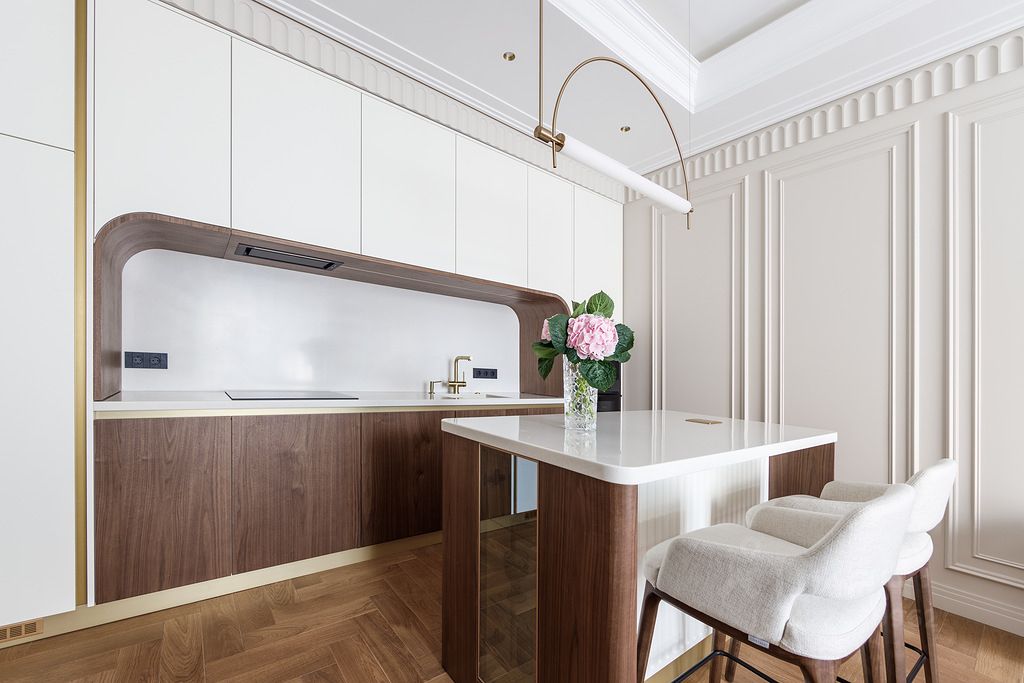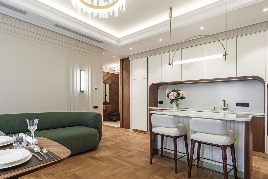 В квартире предусмотрена гостиная с кухонной и барной зонами, мастер-