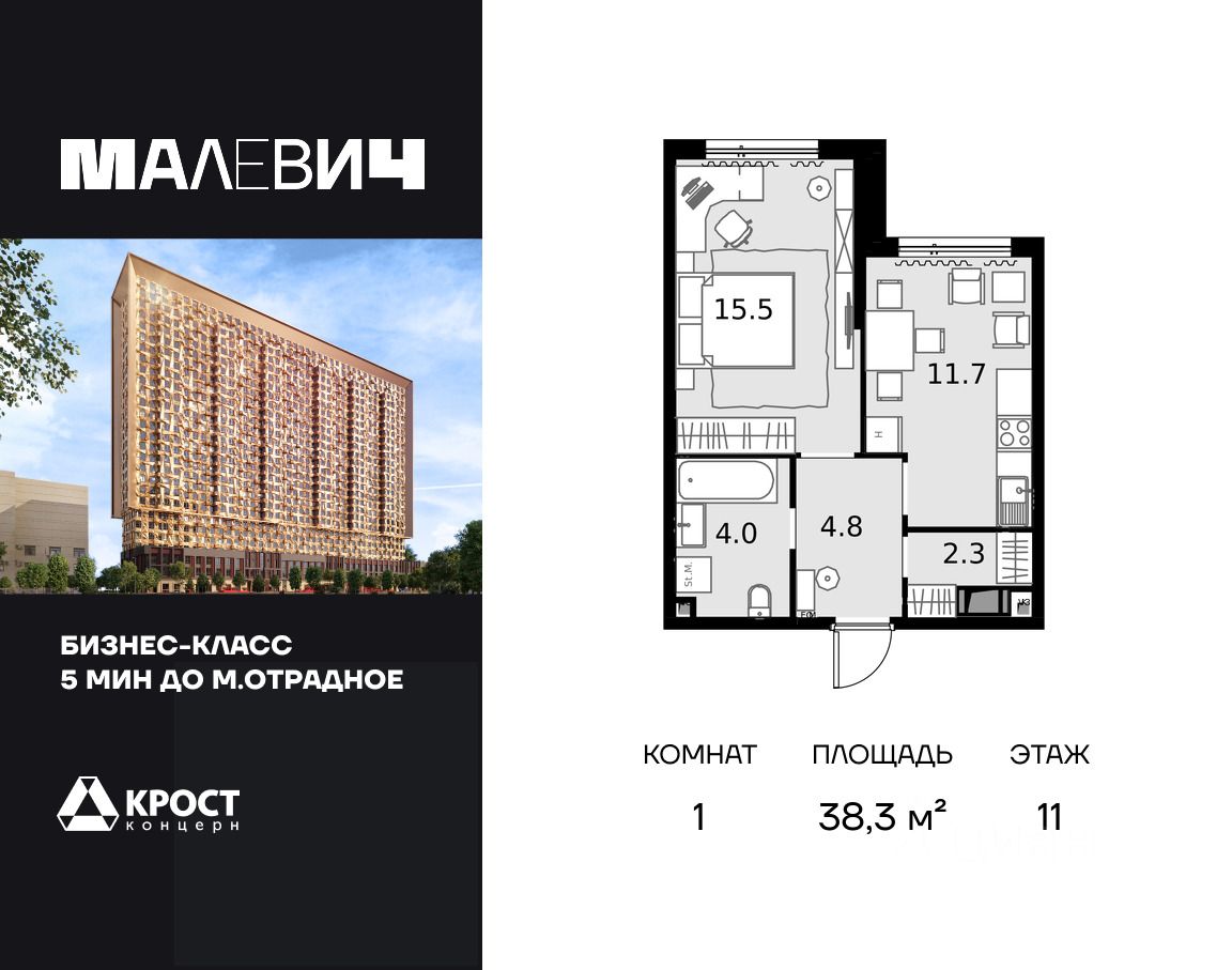 Продаётся 1-к квартира 38.3 кв.м. на 11-м этаже 28 этажного дома.