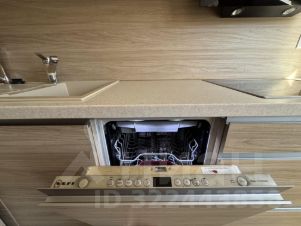 В кухонной зоне установлен качественный немецкий кухонный гарнитур, изготовленный на заказ, с каменной столешницей, дорогой техникой Neff и встроенной посудомоечной машиной.