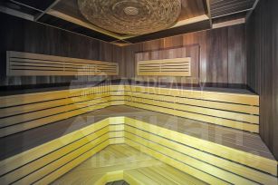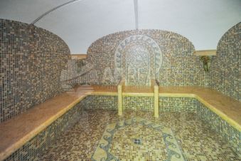 Второй уровень: холл с кухней 175 кв.м., спальня, помещение домашнего кинотеатра, сауна, хамам, подсобные помещения.