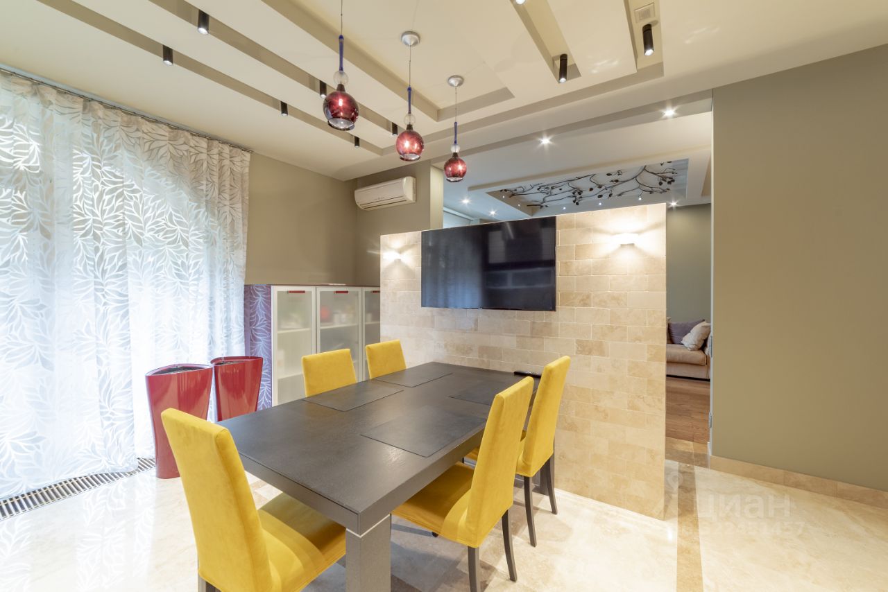 Интерьер квартиры представляет собой гармоничное сочетание классики и современного стиля. Отделка выполнена с использованием премиальных материалов и мрамора.