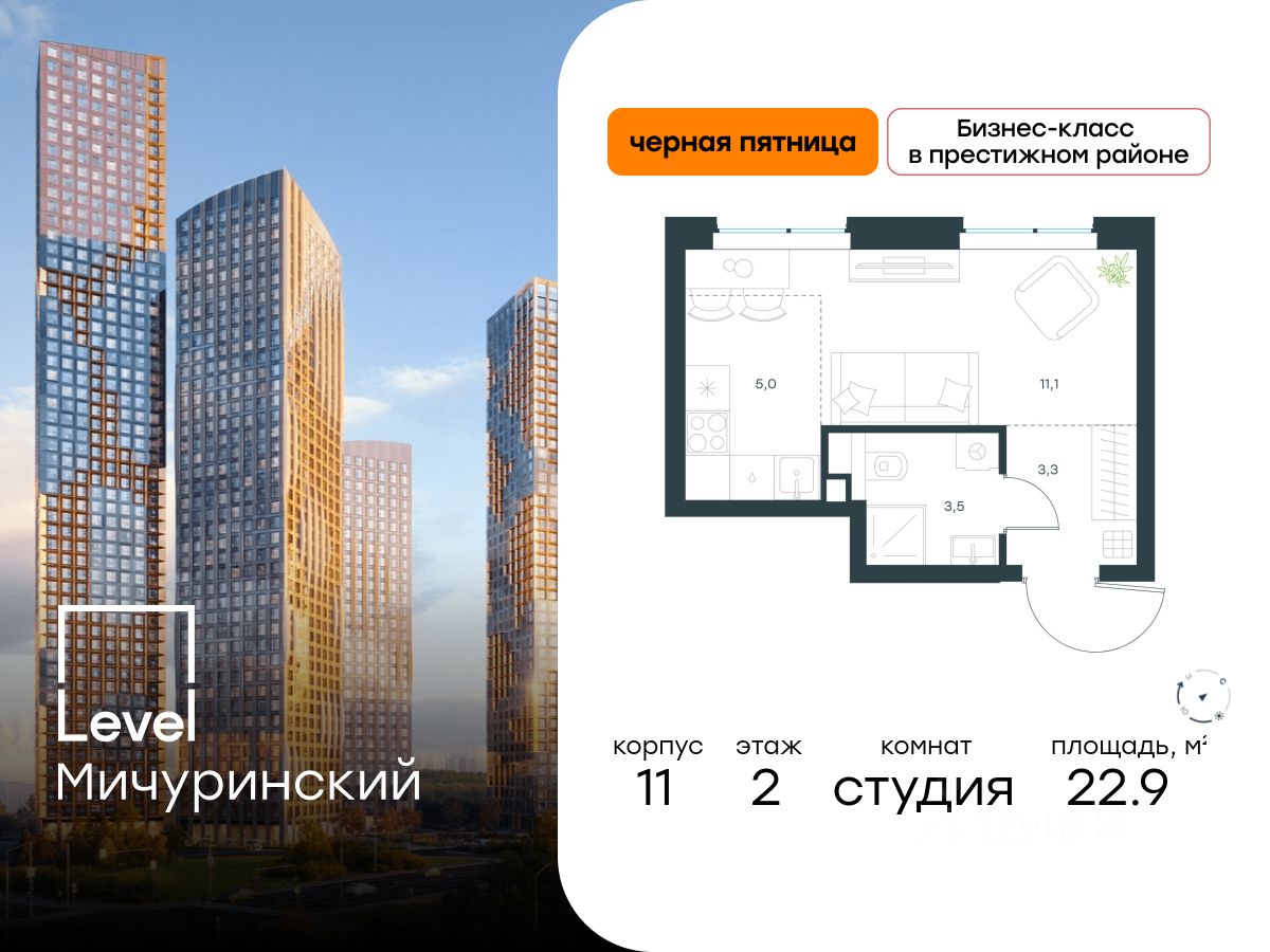 В жилом квартале, расположенном на границе с природным заказником "Долина реки Очаковки", продаётся студия площадью 22.90 кв.м с отделкой white box. Квартира расположена на 2 этаже 24-этажного корпуса Корпус 11 в жилом комплексе бизнес-класса Level Мичуринский (компания Level Group/Левел групп).