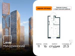 В жилом квартале, расположенном на границе с природным заказником "Долина реки Очаковки", продаётся студия площадью 21.30 кв.м без отделки. Квартира расположена на 16 этаже 24-этажного корпуса Корпус 11 в жилом комплексе бизнес-класса Level Мичуринский (компания Level Group/Левел групп).