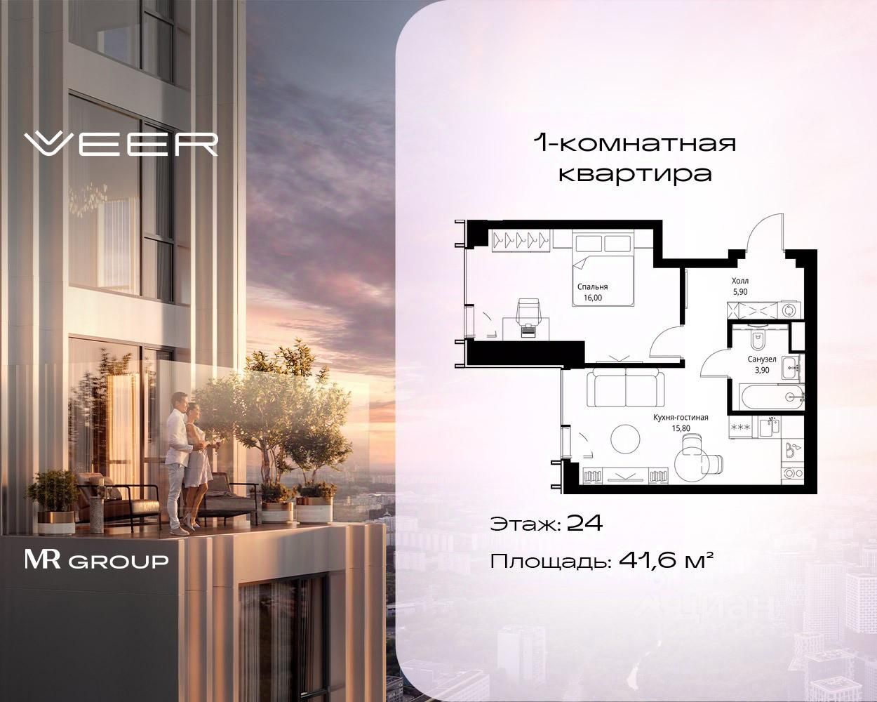 Продаётся 1-к квартира общей площадью 41.60 м² без отделки в ЖК VEER на 24-м этаже 59 этажного дома.