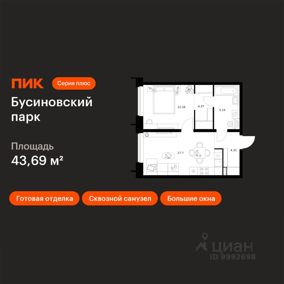 Продаётся 1-комн. квартира площадью 43,69 кв.м на 5 этаже 32 этажного дома (Корпус 1.4, Секция 2) проекта ПИК Бусиновский парк. Светлый просторный подъезд на уровне земли, функциональная планировка, большие окна, c отделкой.