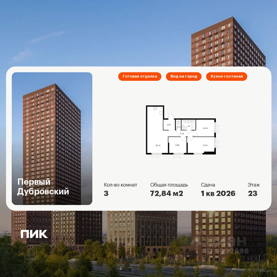 Продаётся 3-комн. квартира площадью 72,84 кв.м на 23 этаже 33 этажного дома (Корпус 1.3, Секция 1) проекта ПИК Первый Дубровский. Светлый просторный подъезд на уровне земли, функциональная планировка, большие окна, c отделкой.