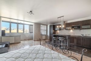 В квартире выполнен дизайнерский ремонт, который подчёркивает её современный стиль и уют. Планировка позволяет эффективно использовать пространство, большие окна выходят во двор, отличная освещённость в течение всего дня. Студия оборудована современной мебелью и техникой.
