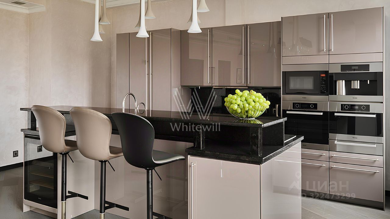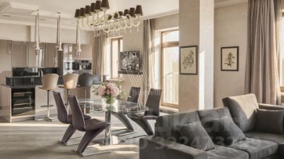 Спланирована просторная кухня-гостиная с островом и обеденной зоной, мастер-спальня со своей гардеробной и ванной комнатой с джакузи и душем, вторая спальня или кабинет, санузел с душем, постирочная, гардеробная, прихожая. Квартира полностью меблирована и оборудована бытовой техникой Miele, установлен винный шкаф.