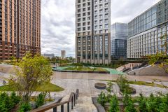 Просторные двухуровневые входные группы с высокими потолками, колясочные и зоны ожидания у каждого из входов. Дизайнеры бюро HAAST создали интерьер лаунж-зоны, вдохновившись природой. Специально подобранные материалы с натуральной текстурой камня и латуни, зелень керамогранита на стенах, роскошная меблировка и картины с флористическими мотивами или наоборот абстракции с буйством сочных красок тонко сочетаются между собой, которые освещаются причудливыми медными светильниками, наполняя пространство домашним уютом.