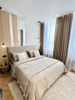 В квартире выполнен качественный дизайнерский ремонт, никто не проживал. Трендовая мебель, модные закругления и освещение не оставит Вас равнодушными.