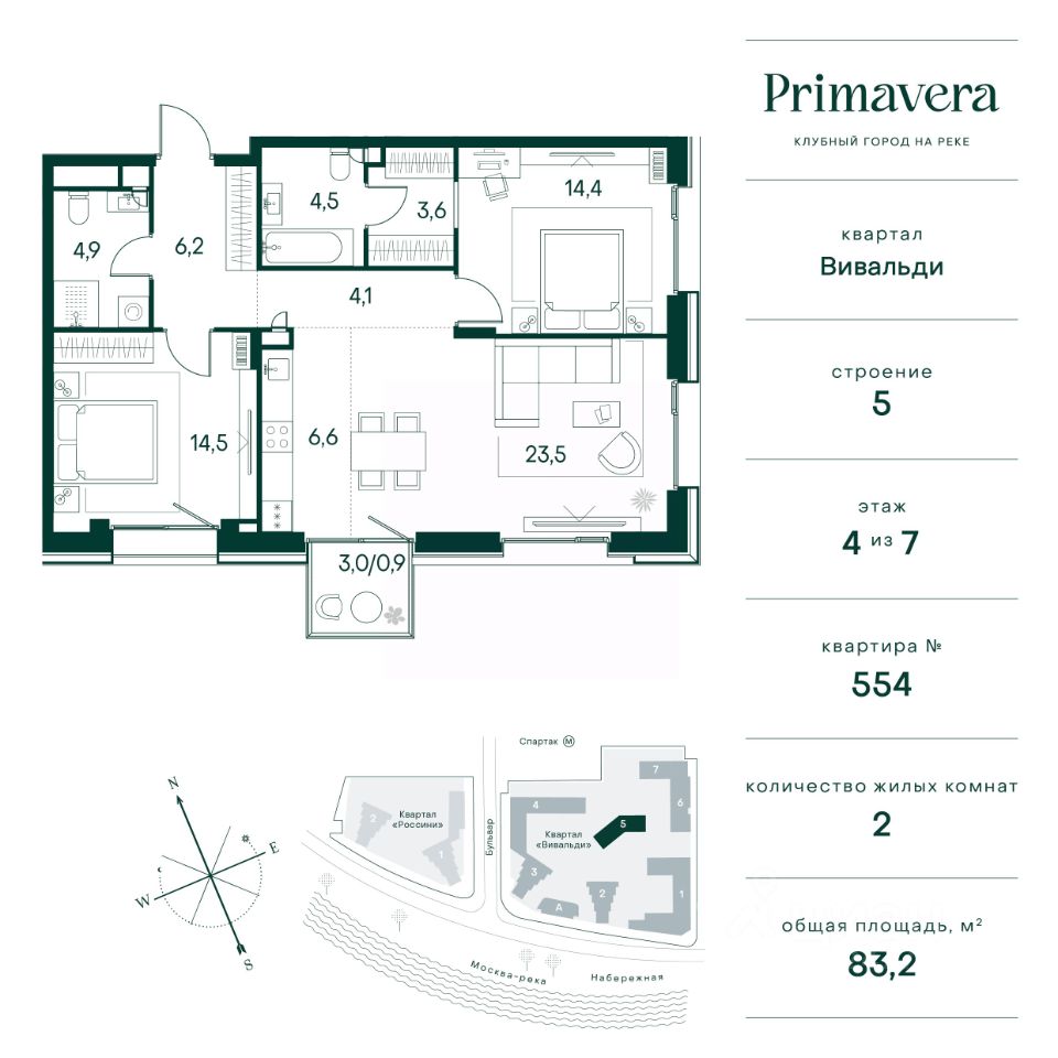 Клубный город на реке Primavera — это современный жилой комплекс премиум-класса, расположенный на первой береговой линии Москвы-реки в экологически чистом районе Покровское-Стрешнево. Под панорамными окнами квартир находится собственный экопарк с продуманной сетью прогулочных дорожек и современными детскими и спортивными площадками. За парком расположена набережная с собственным пляжем и зонами для отдыха. Клубный город на реке Primavera предлагает широкий выбор планировок для различных жизненных сценариев: от просторных однокомнатных квартир до пентхаусов и жилых помещений с террасами и патио. Выберите из 120 вариантов эргономичных планировок стандартного и евроформата. Из каждой квартиры открываются красивые виды на реку с углом обзора в 270 градусов. Дизайнерские лобби предлагают панорамный обзор на благоустроенный двор. Высокие потолки в 6 метров и качественная отделка создают атмосферу, схожую с пятизвездочными отелями. В Primavera есть всё необходимое для комфортной жизни в мегаполисе: • Образование для детей в шаговой доступности: 4 школы, 8 детских садов и развивающие центры с кружками и секциями. • Удобства на расстоянии приятной прогулки: супермаркеты, кафе, рестораны с верандами, салоны красоты, аптеки и многофункциональный центр для шоппинга и развлечений. • Умный дом: автоматизированное бесконтактное управление основными системами доступа и безопасности через мобильное приложение. Клубный город на реке Primavera выгодно сочетает комфорт городской жизни с близостью к природе. Живите в месте, где все создано для вашего удобства!