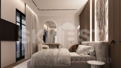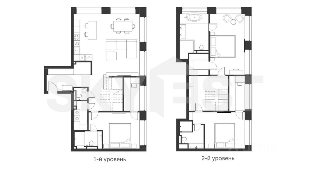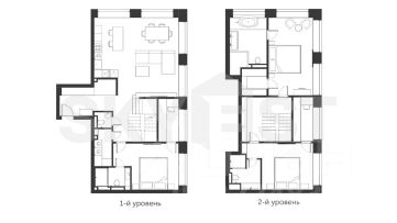 Планировка: первый уровень: кухня - гостиная, мастер спальня с отдельным кабинетом, гостевой санузел и постирочная. Второй уровень: 2 спальни со своими гардеробными и сомещенными санузлами.
